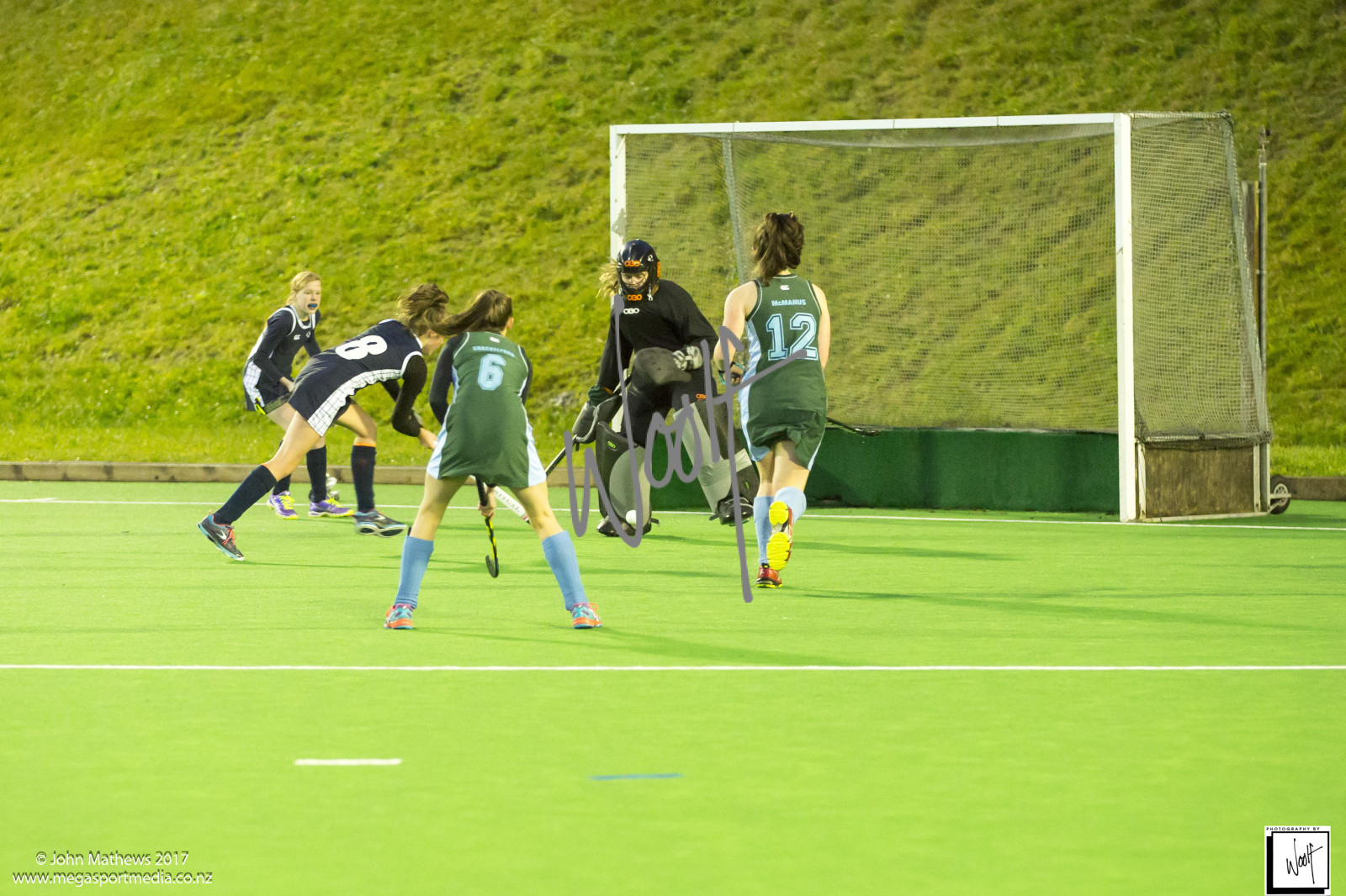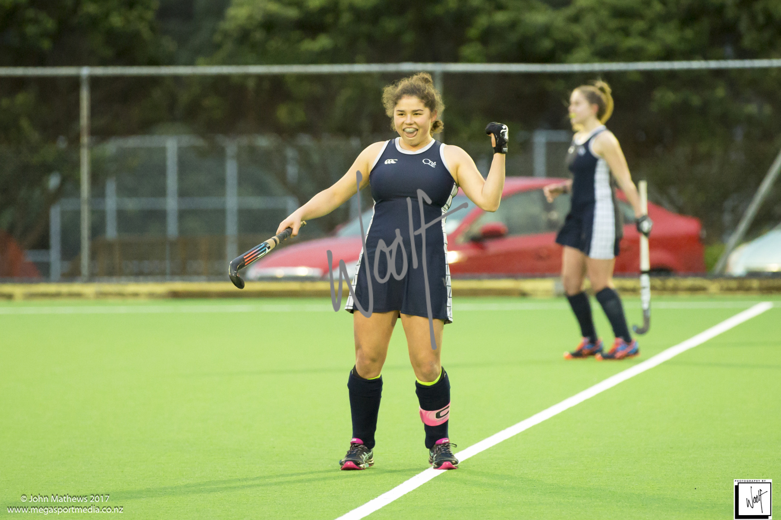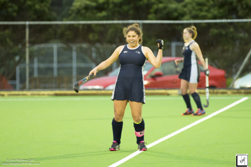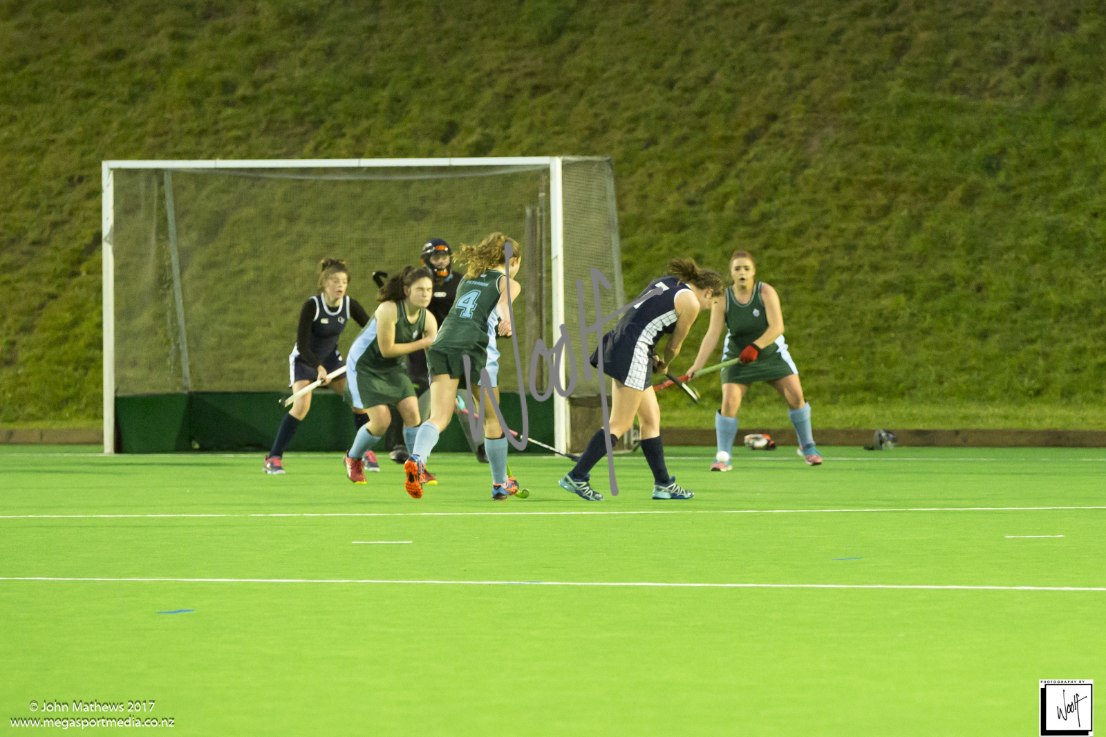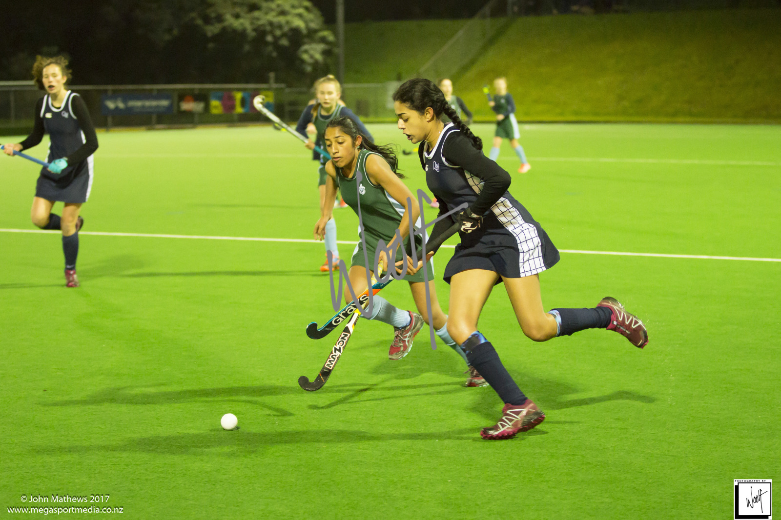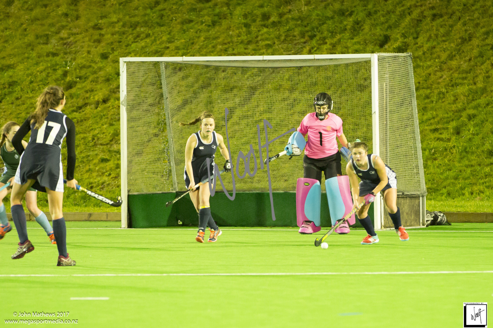 Images captured on 28 July 2017 of the Secondary School Girls Premier 1 hockey match between Queen Margaret College (navy) and Samuel Marsden Collegiate (green) played at the National Hockey Stadium, Wellington, New Zealand won by Queen Margaret College 2-0 Copyright: John Mathews 2017.