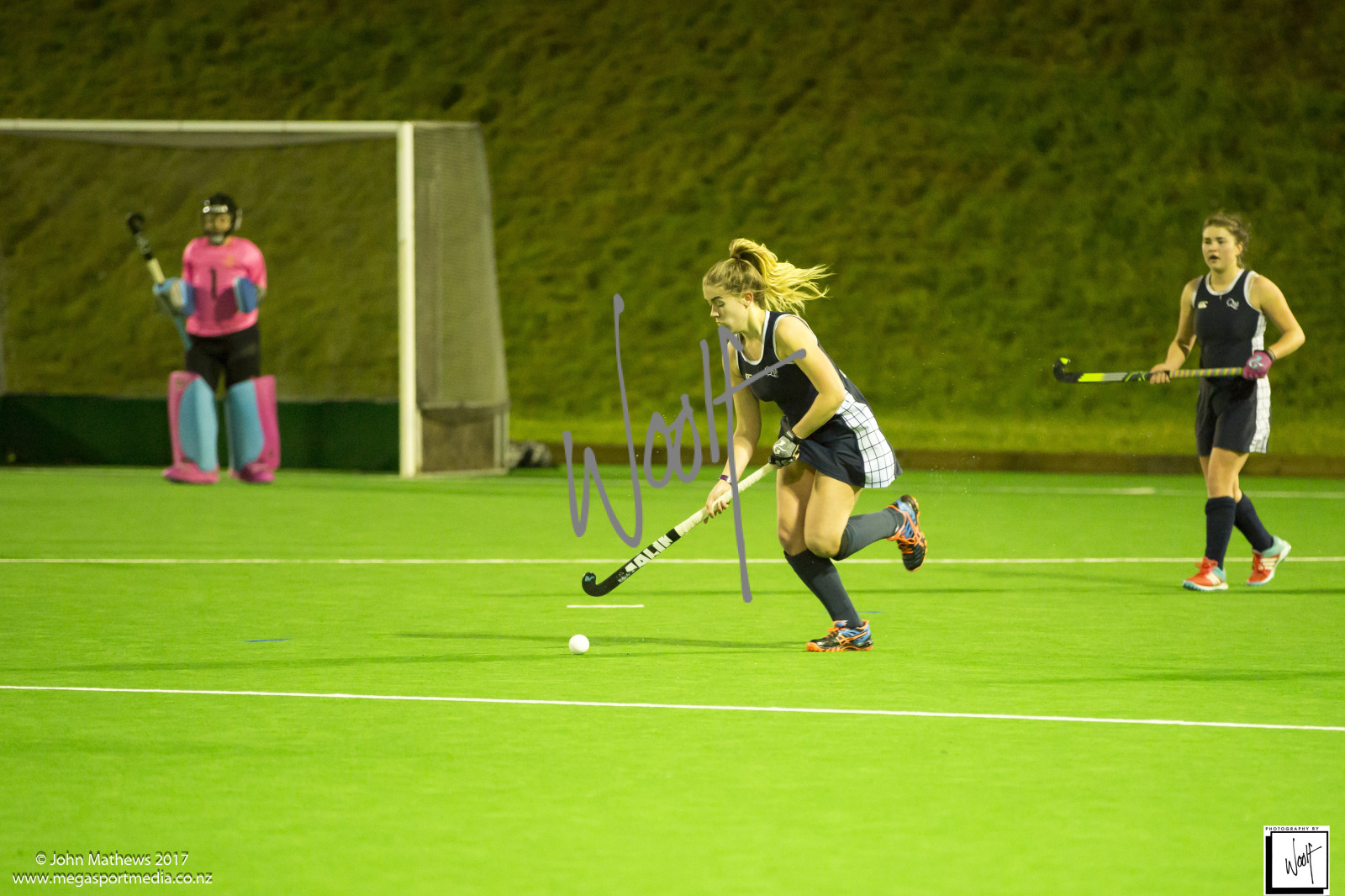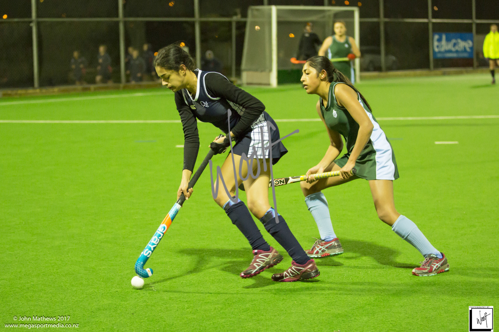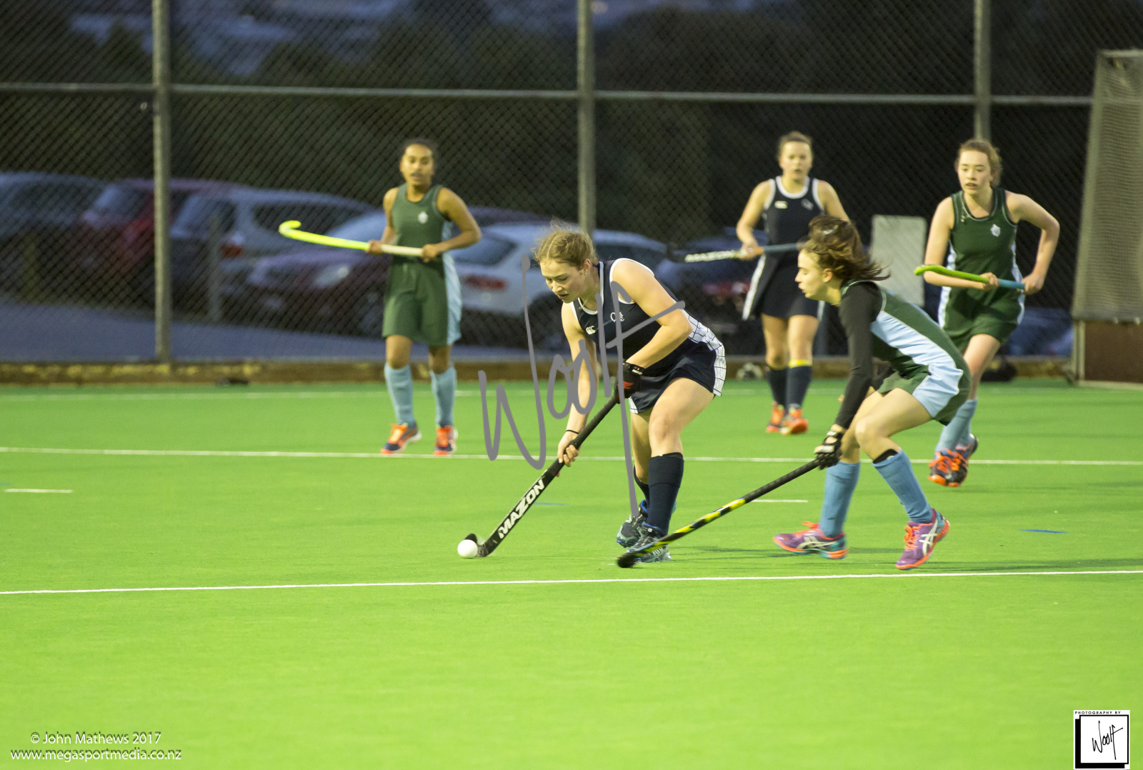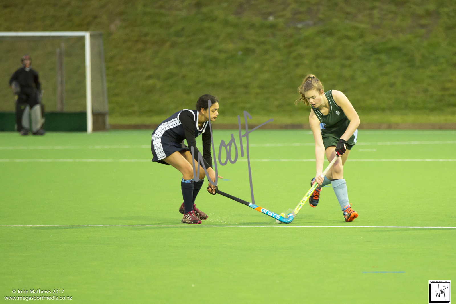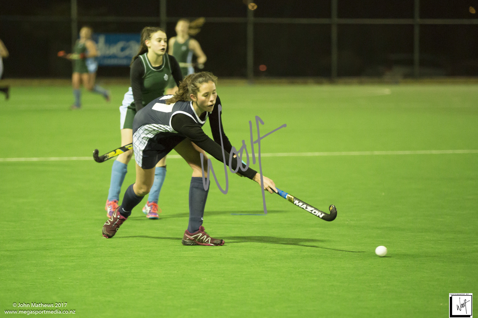 Images captured on 28 July 2017 of the Secondary School Girls Premier 1 hockey match between Queen Margaret College (navy) and Samuel Marsden Collegiate (green) played at the National Hockey Stadium, Wellington, New Zealand won by Queen Margaret College 2-0 Copyright: John Mathews 2017.