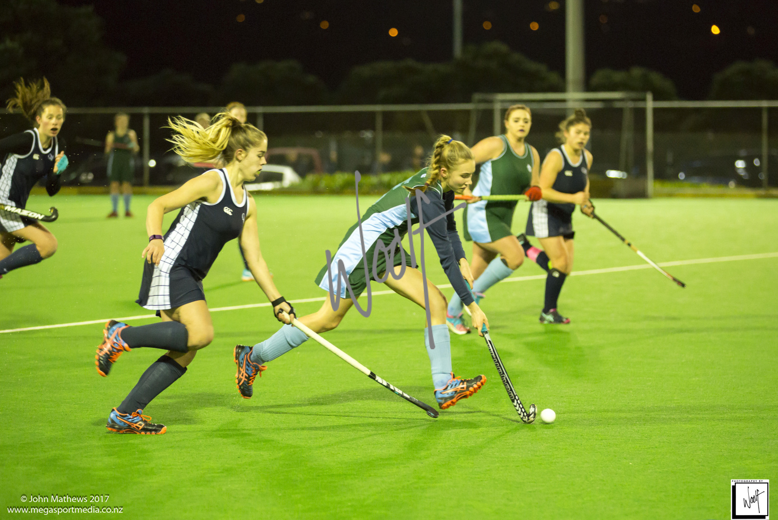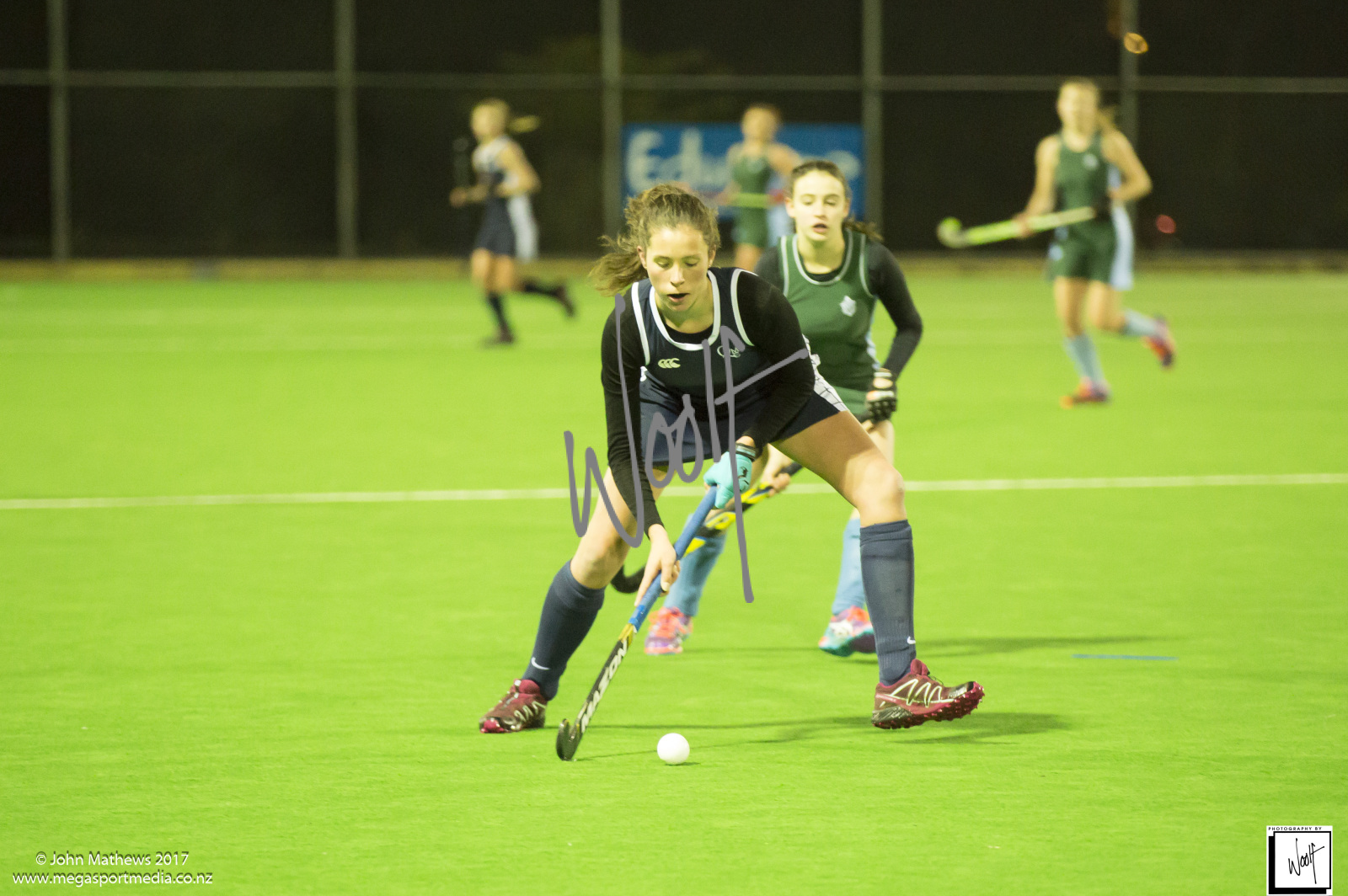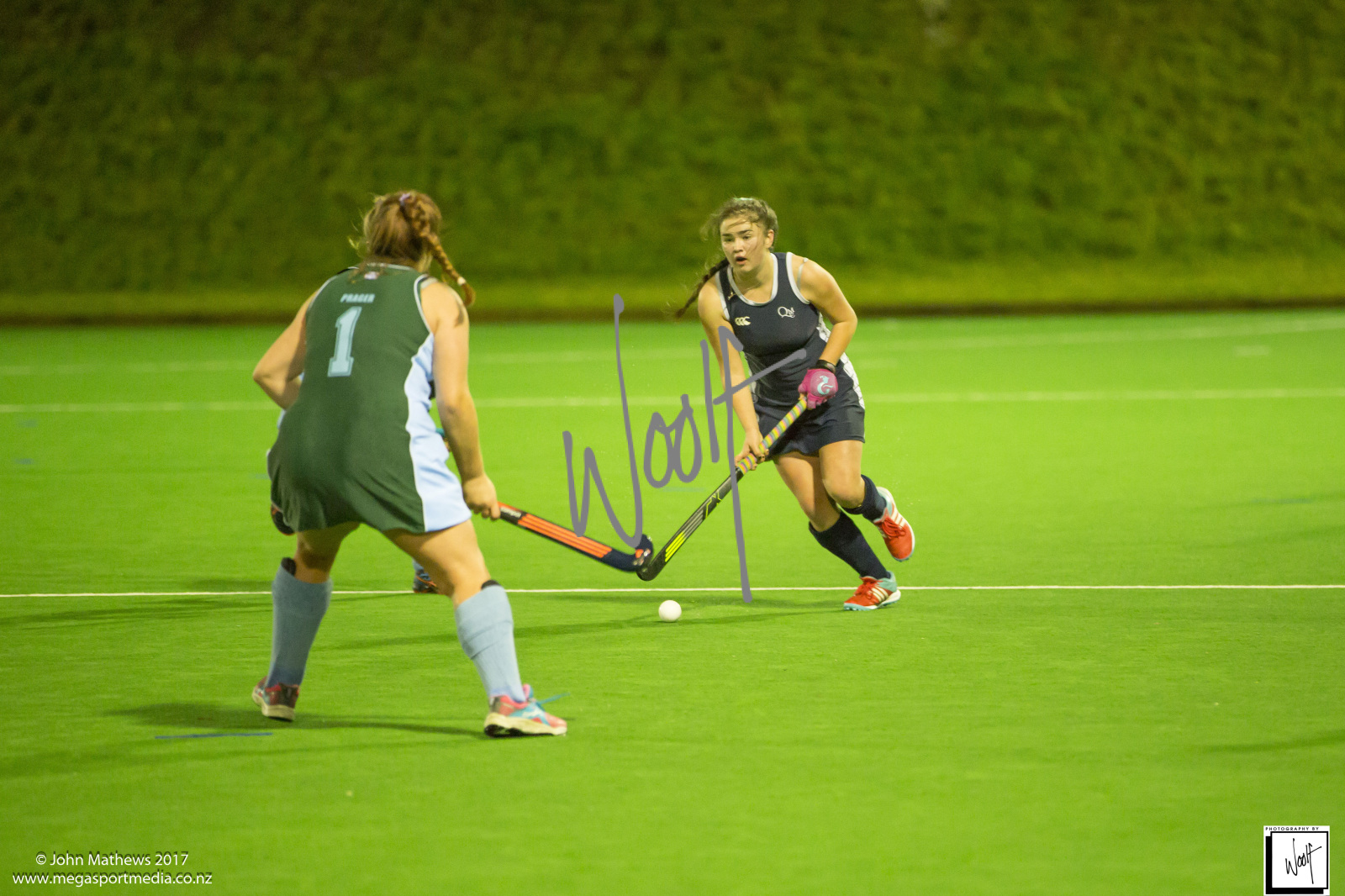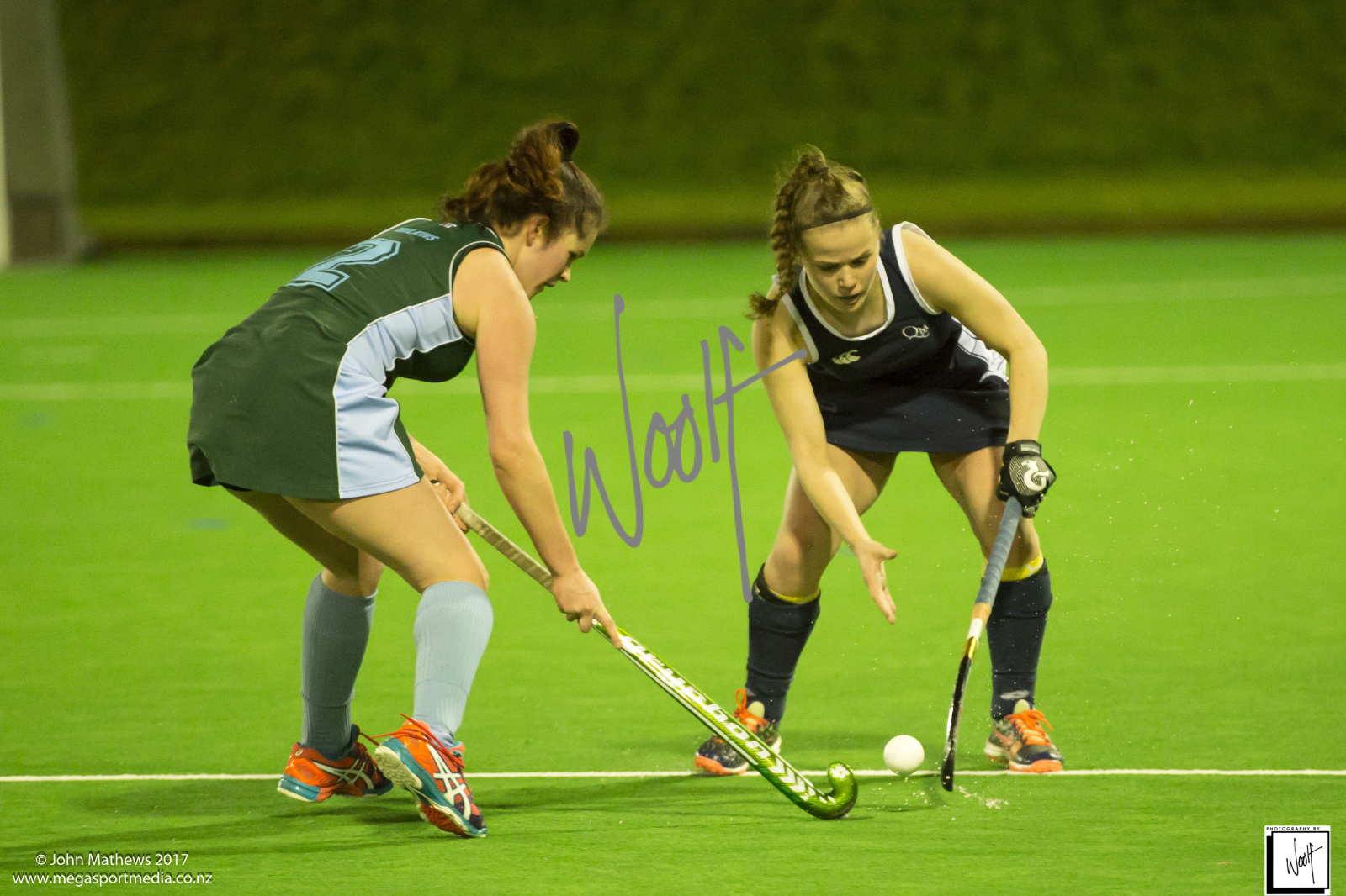 Images captured on 28 July 2017 of the Secondary School Girls Premier 1 hockey match between Queen Margaret College (navy) and Samuel Marsden Collegiate (green) played at the National Hockey Stadium, Wellington, New Zealand won by Queen Margaret College 2-0 Copyright: John Mathews 2017.